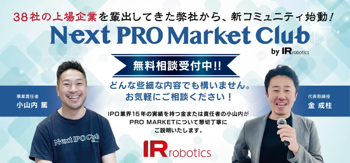 IR Robotics株式会社が2026年2月1日に発足した「Next PRO Market Club」は、主に経営者を対象とした新たな会員制コミュニティです。このサービスは、上場準備や成長戦略を考える経営者に向け、実務に基づいた情報提供や同じ境遇の経営者同士のネットワーキング、そして専門家との連携を通じて支援を行います。