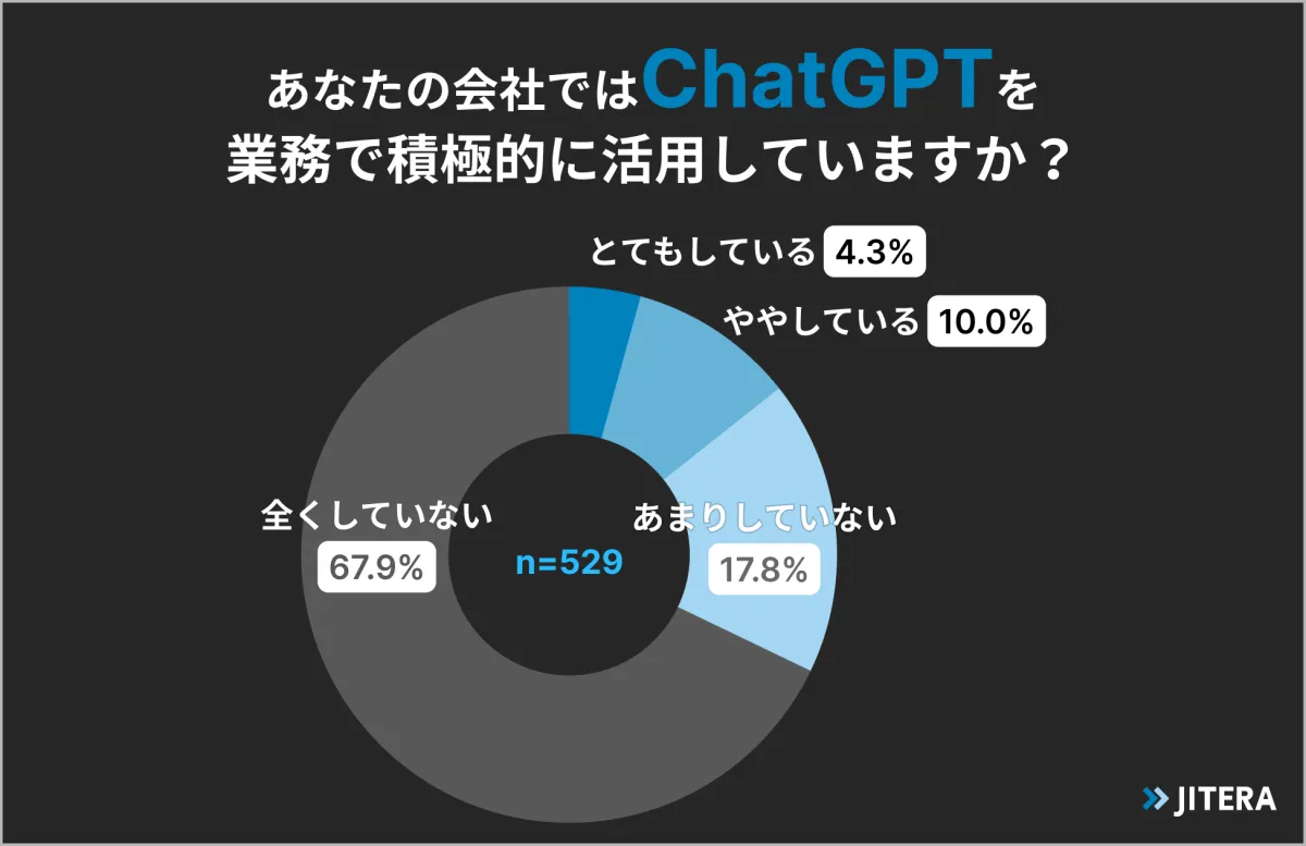 調査によると、ChatGPTを業務で積極的に活用している企業は約1割に留まりました。多くの企業では、まだ導入が進んでいないのが現状です。これは、生成AIへの理解不足や、情報セキュリティへの懸念、適切な運用ルールが確立されていないことなどが要因として考えられます。