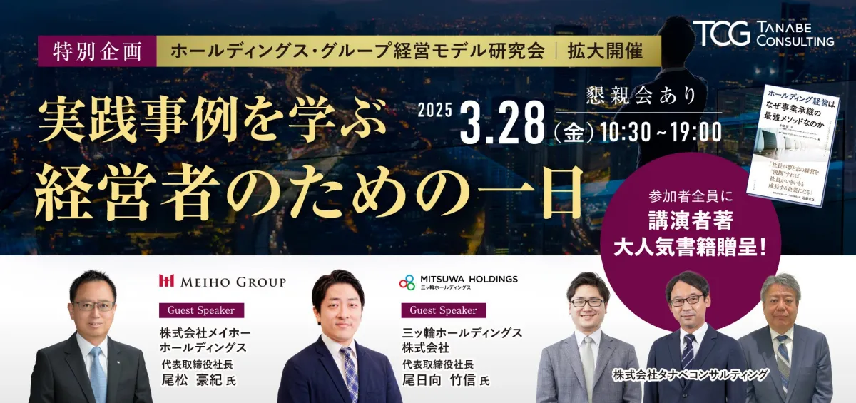 株式会社タナベコンサルティングは、2025年3月28日(金)に、経営者向けの特別セミナー「実践事例を学ぶ 経営者のための一日」を開催します。このセミナーでは、ホールディングス・グループ経営モデルを活用した成功の事例を学び、実践的な経営ノウハウを得ることができます。