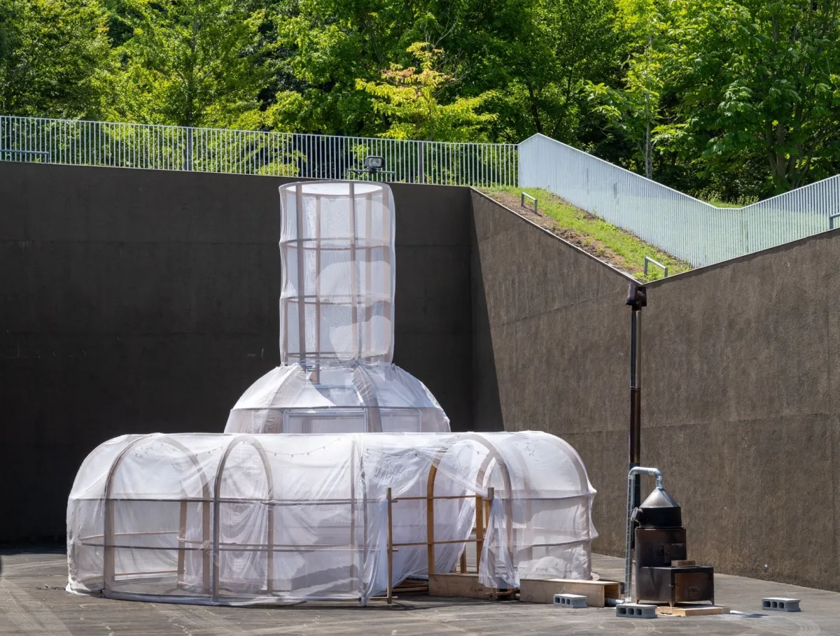 栗林隆は、現代美術家として「境界」をテーマにした作品を数多く手がけています。《元気炉》は原子炉の形状を模した構造物で、薬草の香りを帯びた蒸気を発生させ、参加者はその中に入って体験することができます。この作品は、東日本大震災を契機に福島での経験から生まれたもので、地域の人々に元気を与えることを目的としています。初日、栗林は「皆さんの元気がエネルギーを生む《元気炉》と名付けました」と語り、青森を代表する美術館で自作品を展示することへの期待を述べました。