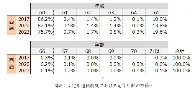 調査の結果、多くの企業は65歳までの雇用確保を、60歳定年制の下での再雇用制度を通じて実現していることがわかりました。しかし、近年の傾向としては、定年の延長や再雇用年齢の上限が70歳にまで広がっており、ますます多くの高齢者が働ける環境が整備されています。2023年の定年年齢の統計を見ると、60歳が圧倒的に多いものの、前年比で15.7%の減少が見られ、企業の多くが定年を65歳に引き上げていることが顕著です。
