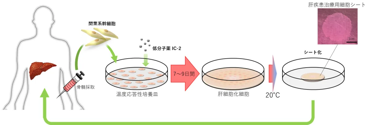 この状況への対策として、鳥取大学医学部遺伝子医療学分野の汐田剛史教授らが独自の低分子薬IC-2を用い、間葉系幹細胞から肝細胞を生成。これを細胞シートとして形成し、肝表面に移植する手法を開発しました。この細胞シートを肝臓に貼り付けることで、線維成分を著しく減少させ、肝臓の再生を促進します。