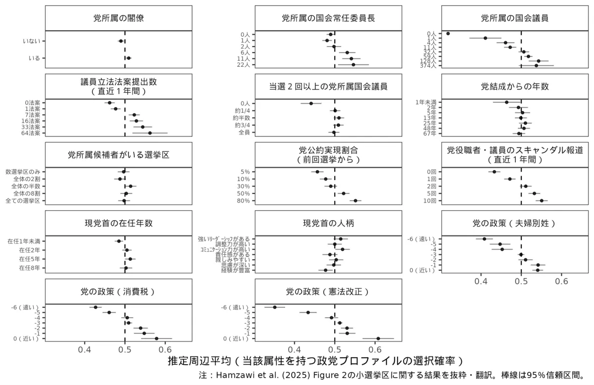 11のヴェイレンス属性の中でも、国会内での議員数や公約実現度、法案提出数、スキャンダルの少なさは特に重視されました。一方で、政党の結党年数や党首の経験に関しては、有権者の評価にはあまり影響を与えないことが明らかになっています。