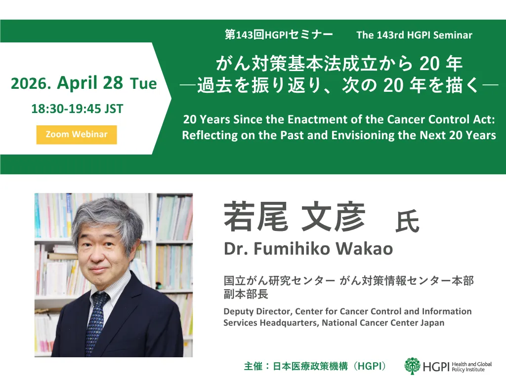 特定非営利活動法人日本医療政策機構(HGPI)は、2026年4月28日に第143回HGPIセミナー「がん対策基本法成立から20年―過去を振り返り、次の20年を描く」をオンラインで開催します。このセミナーでは、がん医療における重要なトピックや最新情報が共有されます。