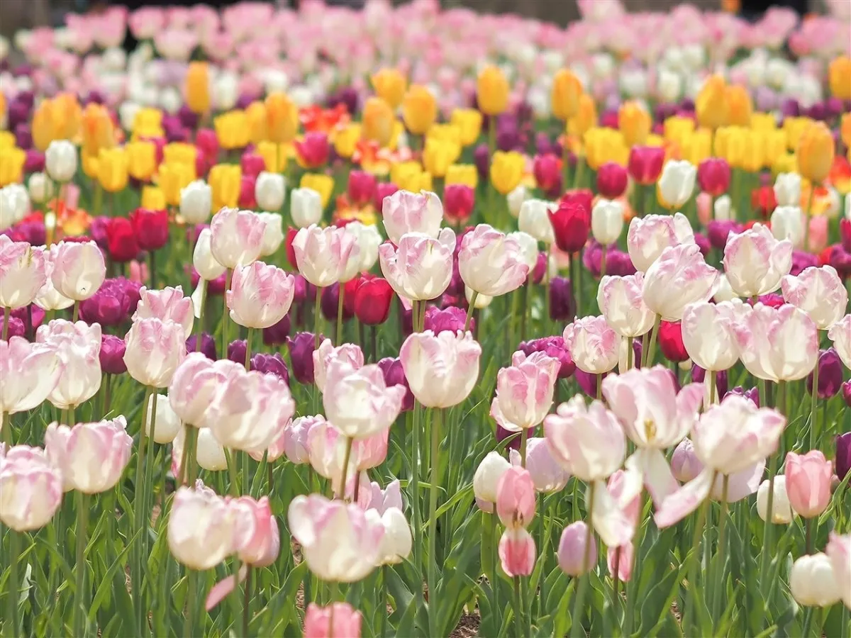 オレンジ、黄色、ピンク、紫といったさまざまな色合いのチューリップが咲き乱れています。全体の風景を楽しむだけでなく、一輪一輪の花の内側に見られる色合いや、グラデーションの美しさにも注目してみてください。