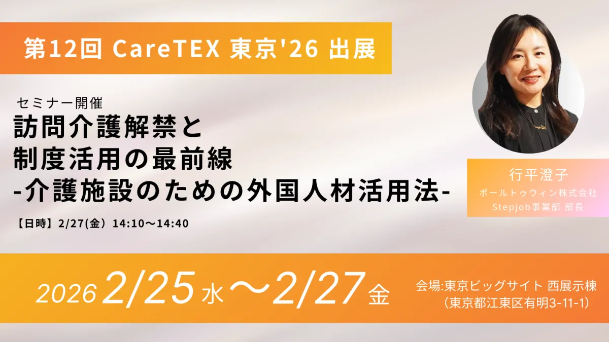 ポールトゥウィン株式会社は、2月25日から27日に東京ビッグサイトで開催される「第12回 CareTEX 東京'26」に出展します。このイベントは、介護業界の製品やサービスが集結する日本最大級の商談展示会であり、そこで外国人介護人材のあり方についてのセミナーも行います。