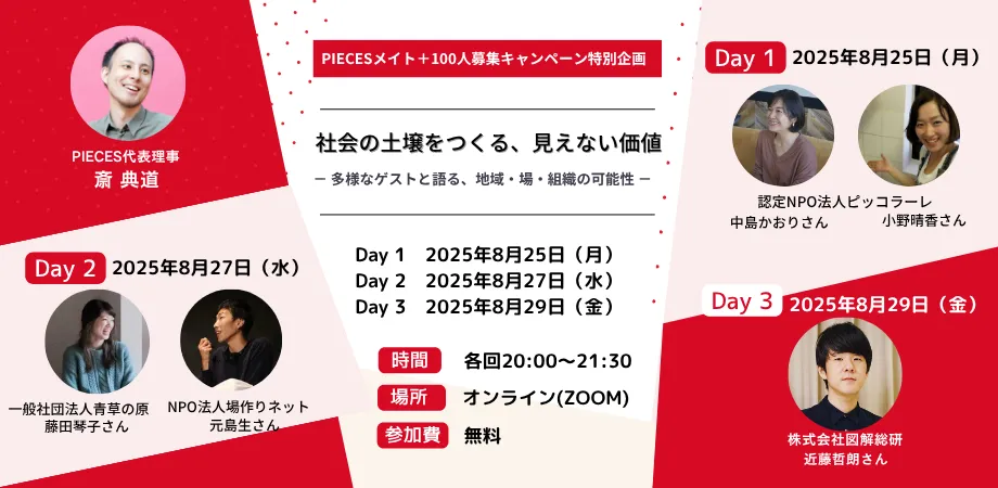 地域や社会の土壌を耕すための重要な挑戦に取り組むNPO法人PIECES。この団体が主催するトークイベントが全3夜にわたり開催されます。イベントでは、地域での協働や場の持つ力、組織の在り方という観点から、目に見えない価値について深い対話を展開します。参加はオンラインで、各回ともに無料です。