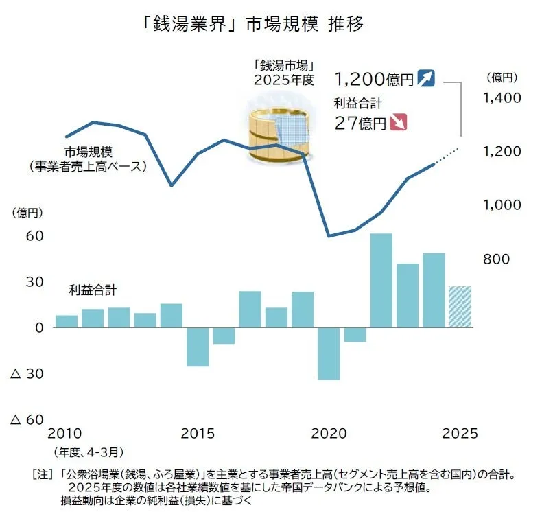 近年、銭湯業界はサウナブームによって市場規模の拡大が見込まれる一方、過酷な経営環境にある。2025年度の銭湯市場は約1200億円に達すると予想されているが、その裏には厳しい現実が潜んでいる。株式会社帝国データバンクの調査によると、2024年度には運営企業の4分の1が赤字に陥る見通しであり、さらには業績が悪化した企業が全体の半数に達しているという。