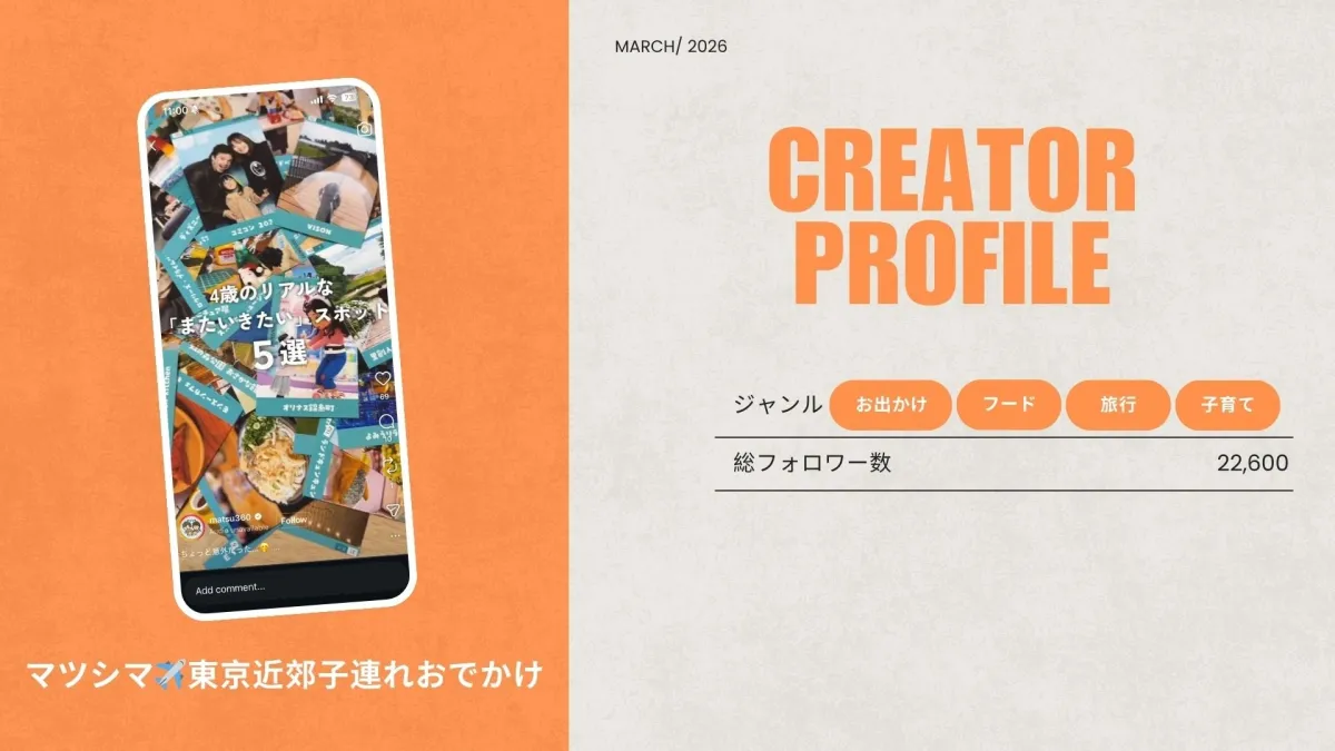 「マツシマ✈️東京近郊子連れおでかけ」は、instagramにてフォロワー数22,600人を誇り、すでに多くのお出かけスポットを取材して情報を発信しています。シンプルで魅力的なショート動画を作成し、親子で楽しめる場所の紹介や、より良い子育てを支援する商品を取り上げています。特に注目すべきは、これまでの投稿の中には、再生回数が10万回以上を超えるものもあるという点です。これは、親たちが求める情報がいかに需要があるかを物語っています。