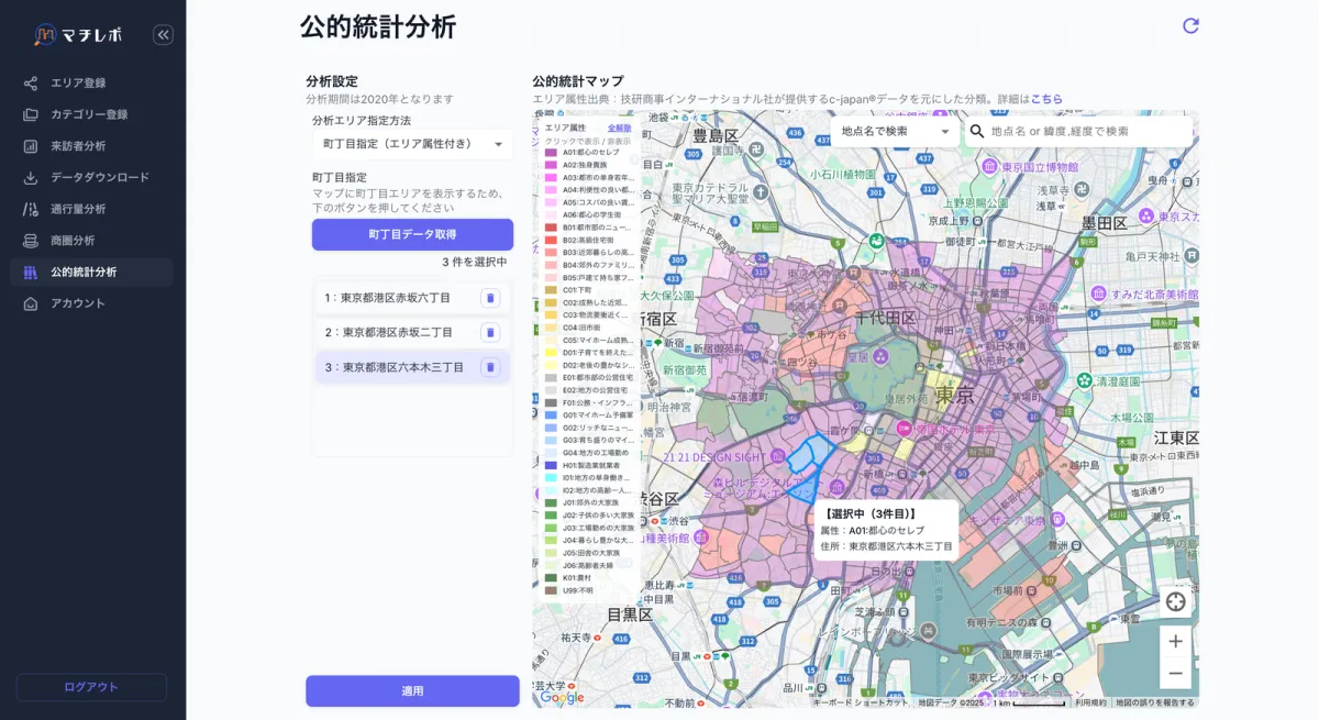 新たに搭載された公的統計分析機能によって、「マチレポ」は誰でも容易に公的統計データにアクセスし、分析に役立てることができます。これにより、商圏分析や出店計画、地域戦略などの意思決定において、より多面的かつ信頼性の高い情報を得ることが可能になります。
