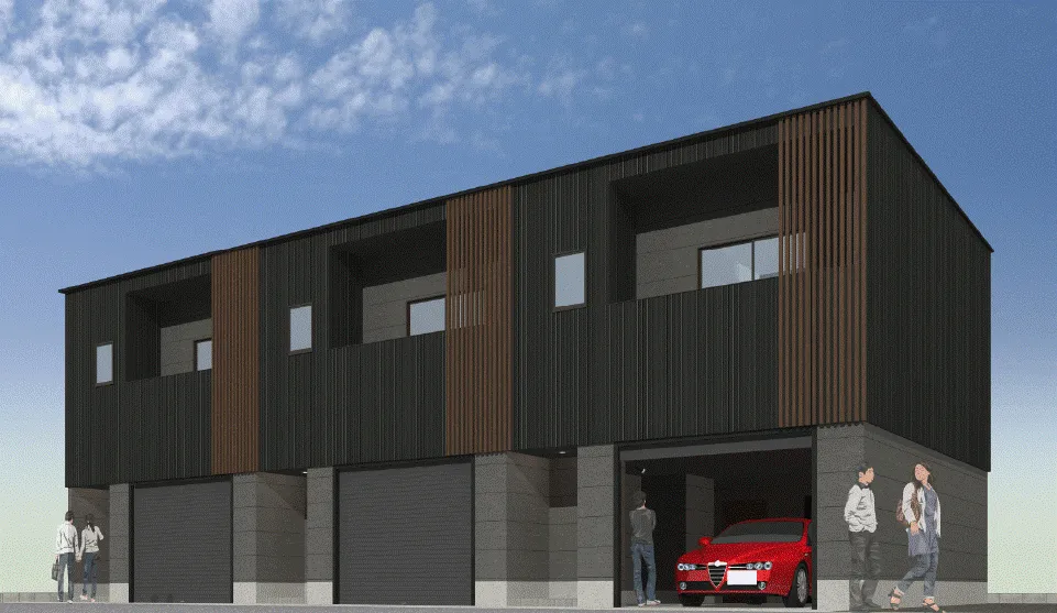 今回の賃貸住宅は、木造2階建てのメゾネットタイプで構成されています。1階にはガレージ、2階には快適な住居スペースが広がる設計となっており、防犯性と実用性を重視しています。また、EV充電に対応したガレージや電動リモコン式シャッターも標準装備されており、平面駐車場も完備されています。