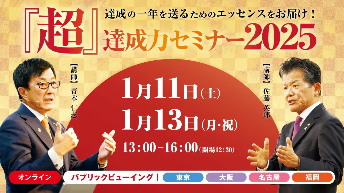 そこで、アチーブメント株式会社では、2025年1月11日(土)と13日(月・祝)の2日間、『超』達成力セミナーを開催します。今年で15年以上の歴史を持つこのセミナーは、全国から約3,000名が参加する人気イベントです。また、今年は新たな試みとして、東京や大阪、名古屋、福岡など全国4か所でパブリックビューイング方式での開催も予定されています。