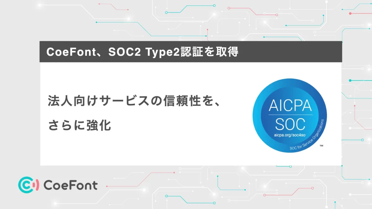 株式会社CoeFont(本社:東京都港区、代表取締役:早川 尚吾)は、AI音声プラットフォーム「CoeFont」において、米国公認会計士協会(AICPA)が定めたセキュリティ認証「SOC2 Type2」を2025年6月に取得したことを発表しました。この取得により、CoeFontはそのセキュリティ体制を一層強化し、安心して利用していただけるサービスを提供することができます。
