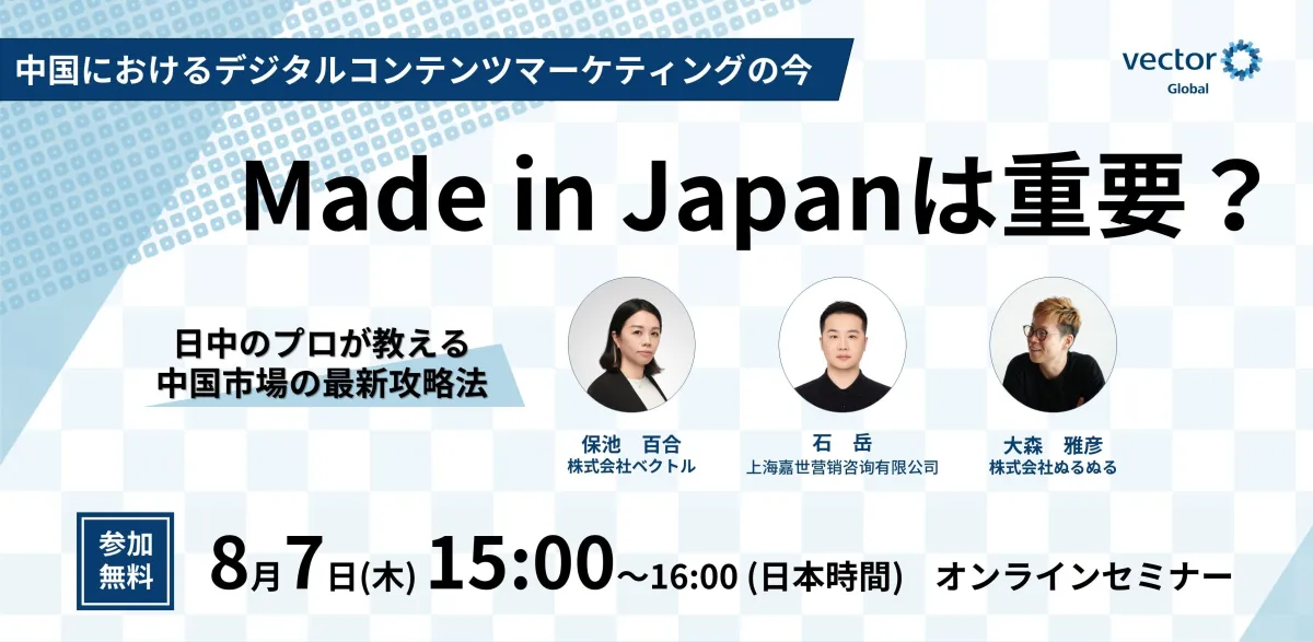 2025年8月7日、株式会社ベクトルは「中国におけるデジタルコンテンツマーケティングの今:中国市場の最新攻略法」と題したオンラインセミナーを開催します。このセミナーは、中国市場への進出や事業拡大を目指す企業の経営者やマーケティング担当者を対象にしています。