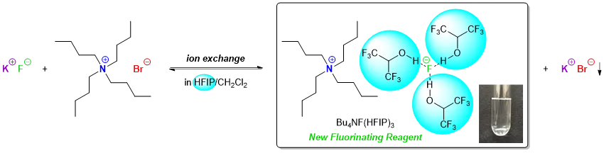 研究チームは、KFが特定のフッ素化アルコールである1,1,1,3,3,3-ヘキサフルオロイソプロパノール(HFIP)に特異的に溶解する特徴を活かし、HFIP中でテトラブチルアンモニウムブロミド(Bu4NBr)とのイオン交換反応を行う方法を考案しました。これにより、Bu4NF(HFIP)3錯体を簡単かつ効率的に合成することに成功しました。さらに、この新しいフッ素化剤は、合成後3ヶ月たってもほとんど吸水せず、長期保存が可能であることが確認されています。