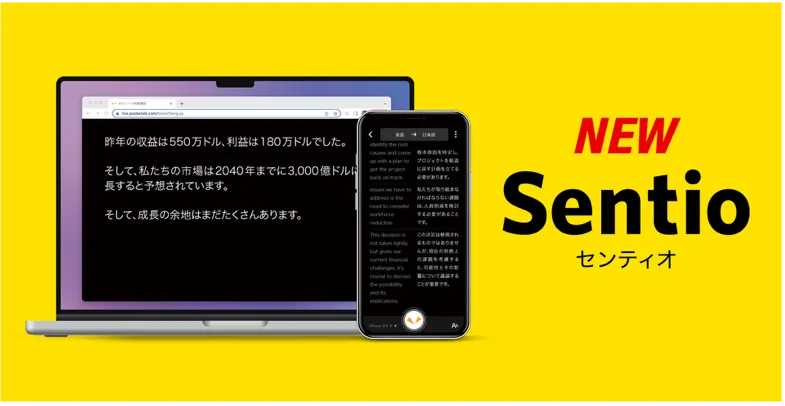 「Sentio」は、ウェブブラウザ上で簡単に利用でき、スマートフォンやPC、タブレットなど多様なデバイスに対応しています。オンライン会議はもちろん、対面での使用も可能です。さらに、新型AI通訳機「ポケトークS2」による翻訳機能も注目されており、91種類の言語に対応します。