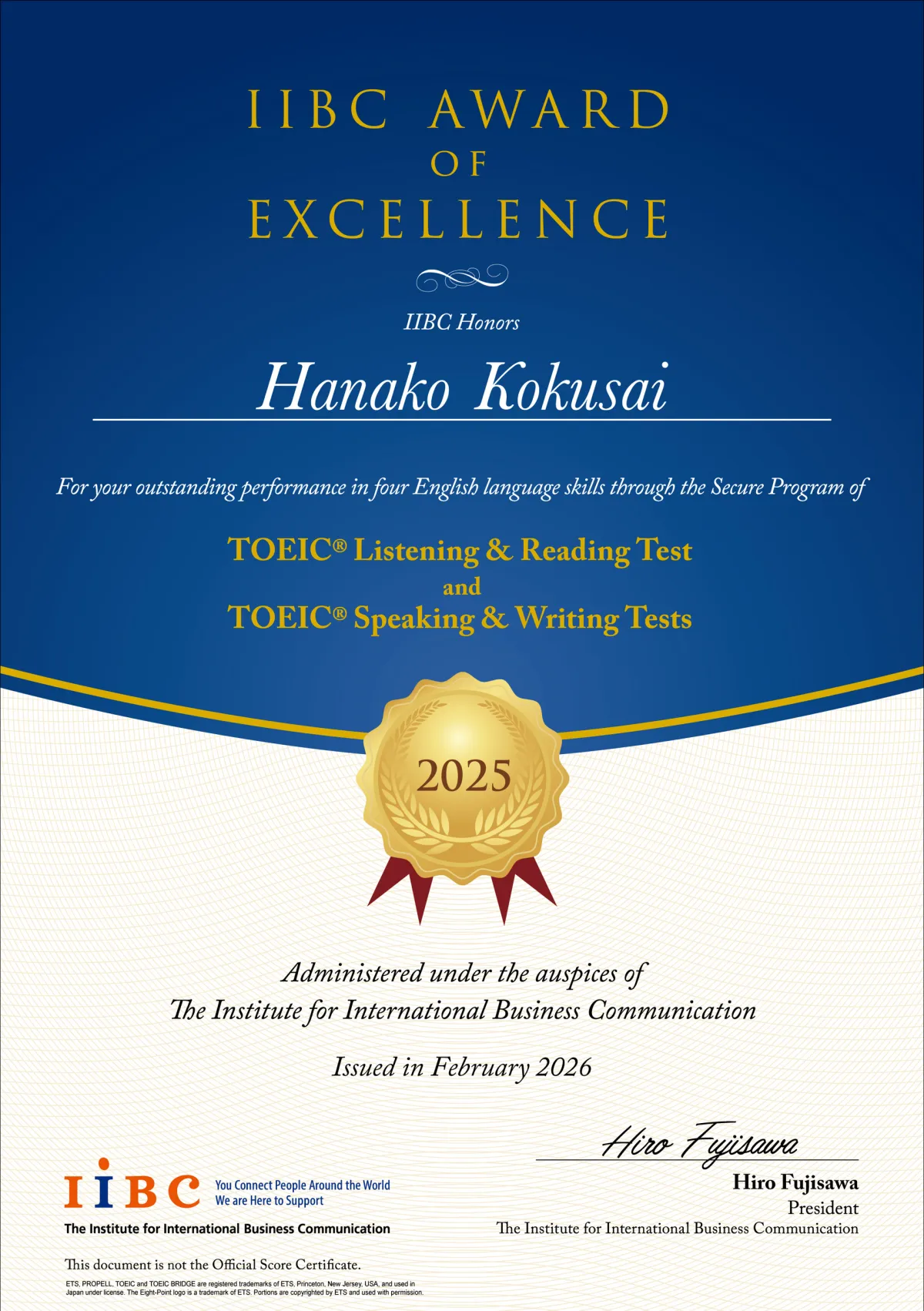 IIBC AWARD OF EXCELLENCEは、TOEIC L&R及びS&Wの両公開テストを受験し、英語の4技能全てにおいて基準スコアをクリアした受験者を表彰する制度です。この賞は、英語をコミュニケーションツールとして活用し、学ぶことを尊重する方々を応援するために始まりました。