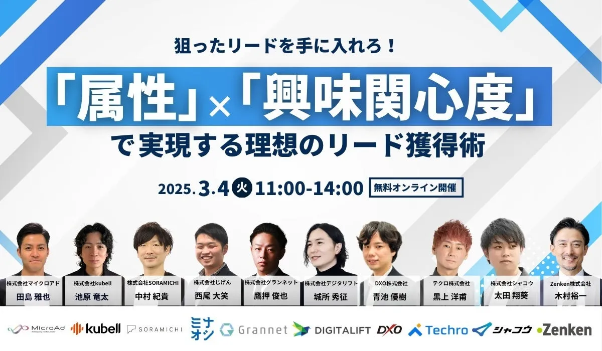 2025年3月4日(火)、株式会社マイクロアドがオンラインウェビナー『狙ったリードを手に入れろ!「属性」×「興味関心度」で実現する理想のリード獲得術』を開催します。本ウェビナーでは、業界のトップリーダー9社が登壇し、ターゲットとの接点を最大化する方法や、質の高いリードを効率的に見つけるための手法を詳しく解説します。