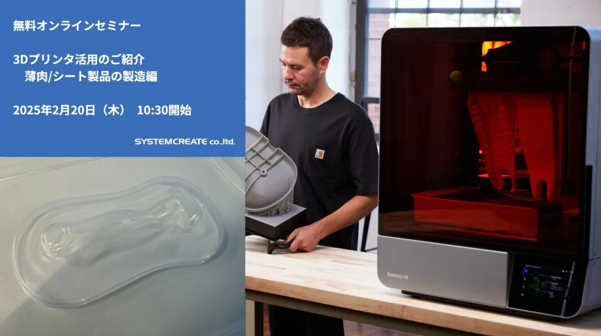 株式会社システムクリエイトは、2025年2月20日(木)にオンラインセミナー「3Dプリンタ活用のご紹介薄肉/シート製品の製造編」を開催します。このセミナーは、薄肉製品やシート製品の製造に関心がある方、または3Dプリンタの活用方法を探している方に向けて、最新の技術と事例を共有することを目的としています。