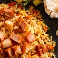 甘辛い特製ダレに絡めたもちもちのちぢれ麺、ボリューム満点で満足感も抜群。