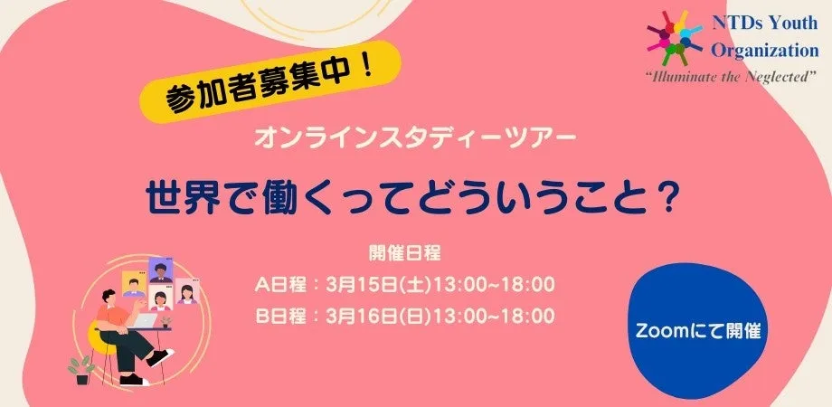 一般社団法人NTDs Youthの会が、若年層のグローバルヘルス分野への興味を高めるためのオンラインキャリアイベントを開催します。このイベントは「オンラインスタディーツアー〜世界で働くってどういうこと?〜」という名称で、参加することで、さまざまな専門家からの貴重なフィードバックやアドバイスを受けることができます。