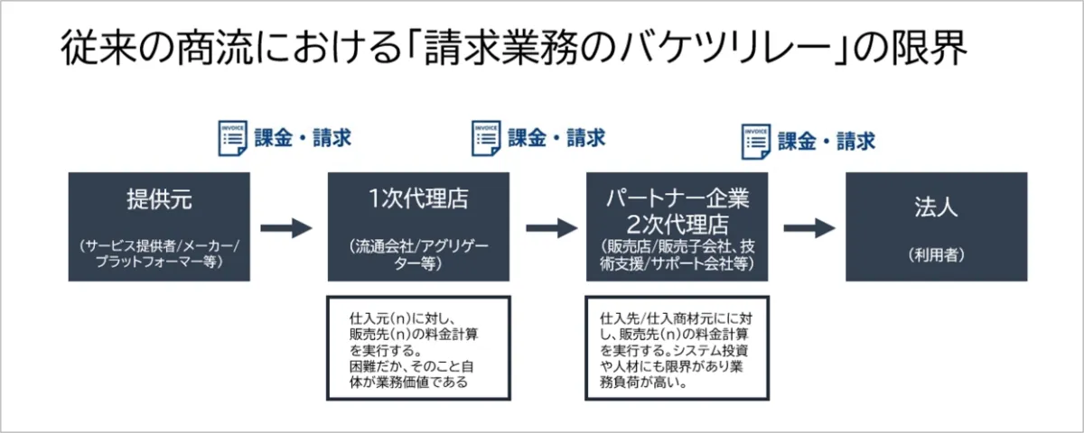 生成AIサービスの事業者間では、従量課金の計算業務が重複することが大きな課題です。このバケツリレー的な業務形態は、時間とリソースの浪費を招き、実際のビジネスにおいて付加価値を創出する機会を損失しています。