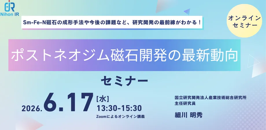 本オンラインセミナーでは、ポストネオジム磁石候補の概況や、Sm-Fe-N(Sm2Fe17N3)磁石に関する情報を詳しく解説します。特に、Sm-Fe-N磁石の商用化の歴史や、難焼結性を克服するための最新の研究開発動向に焦点を当てます。また、成形や緻密化に関する事例も交えて、参加者の理解を深める内容となっています。