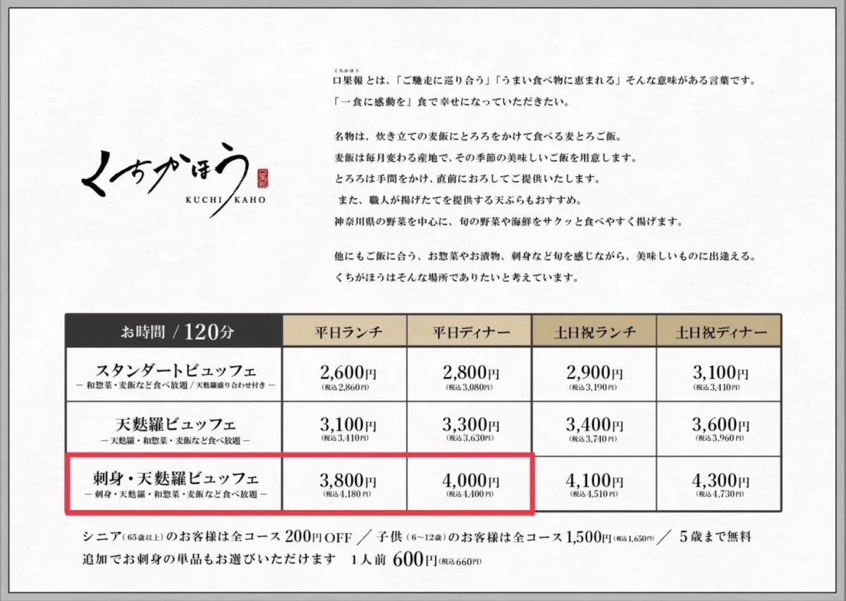 《くちかほう》は「ご馳走に巡り合う」という意味を持つ名の通り、身体に優しい食材を使用し、手作りにこだわり続けています。熟練の料理人が腕を振るい、契約農家から仕入れた無農薬の野菜や、季節に応じた食材をふんだんに使ったメニューが楽しめます。特に名物とされる揚げたての天婦羅や麦とろ飯は、食材の旨みを引き出すおすすめの一品です。