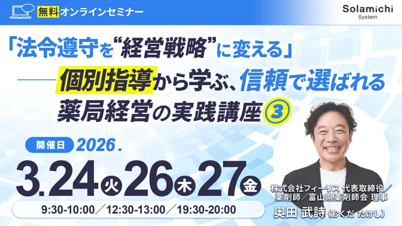 株式会社ソラミチシステムは、次世代の薬局経営を目指した無料のオンラインセミナー、「法令遵守を“経営戦略”に変える」を3月24日、26日、27日に開催します。このセミナーは、薬局経営者や管理薬剤師に向けたもので、特に行政による個別指導に関する理解を深めることを主な目的としています。