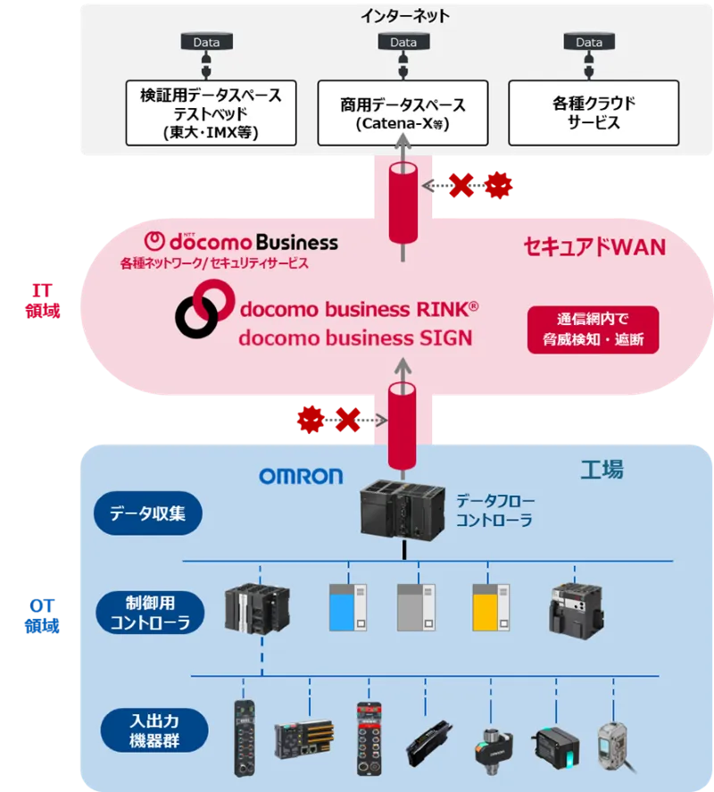オムロンの「データフローコントローラ」は、製造現場のデータの収集と可視化を容易にするためのエッジコントローラです。一方で、NTTドコモビジネスは、高品質なネットワークサービスやセキュリティを兼ね備えたNaaSを提供しています。この二者が手を組むことで、製造現場のデータを安全にクラウドやデータスペースへとつなげることが可能になるのです。