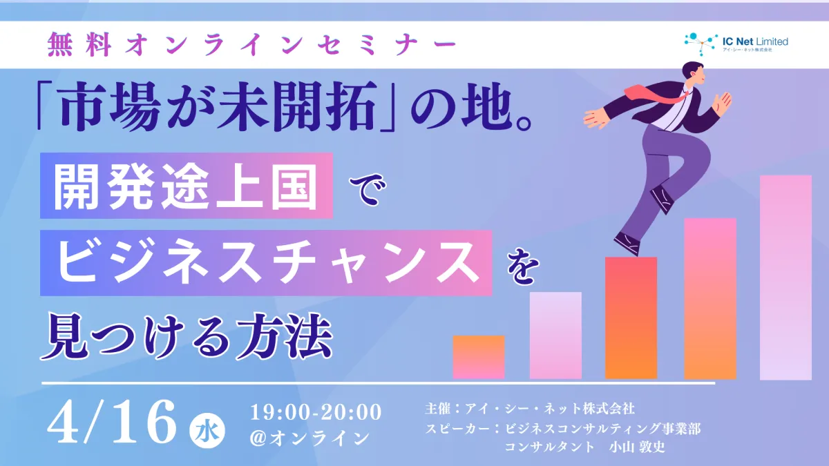 2025年4月16日(水)、アイ・シー・ネット株式会社が主催するオンラインセミナーが開催されます。このセミナーは、未開拓市場に関心がある方々に向けて、発展途上国でのビジネスチャンスや社会課題解決の手法を学ぶ絶好の機会です。