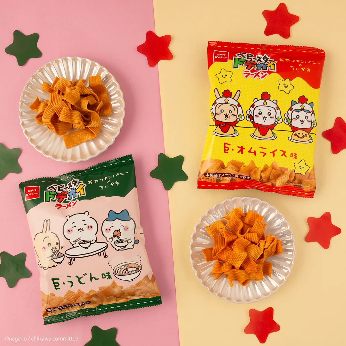 「ベビースタードデカイラーメン」は、幅広の麺を使用した、食べやすさを追求したスナックです。今回のコラボでは、作品に登場する「巨大なオムライス」と「巨大なうどん」をイメージした2つの味が展開されます。