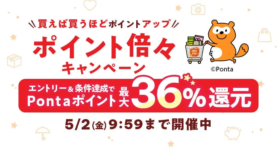 このキャンペーンは、エントリー後に指定商品を購入することで、Pontaポイントが最大36%還元される仕組みです。具体的には、以下のように購入商品数や条件に応じてポイントが還元されます。