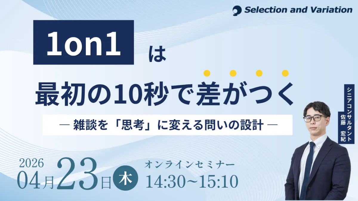組織・人事コンサルティングファームであるセレクションアンドバリエーション株式会社が、2026年4月23日(木)にオンラインで『1on1は最初の10秒で差がつく ― 雑談を「思考」に変える問いの設計 ―』セミナーを開催することを発表しました。