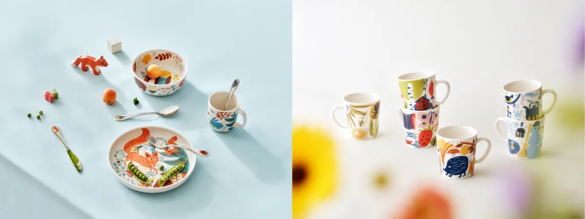 新たなテーブルウェアコレクションには、マグ、ボウル、プレート、カトラリーなど、様々なアイテムがそろっています。それぞれの食器には動物たちの表情が描かれており、シーンに豪華な彩りを添えます。また、贈り物としても喜ばれるような遊び心のあるパッケージデザインも採用されています。