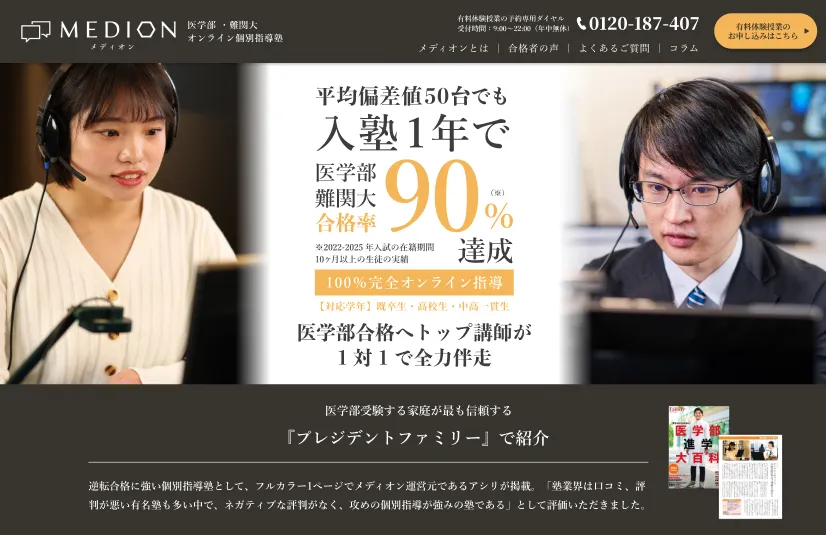 「メディオン」は、医学部受験と難関大学受験に特化したオンライン個別指導塾です。全国の受験生に対し、場所を問わず質の高い指導を提供しています。詳細な情報は公式サイト(
