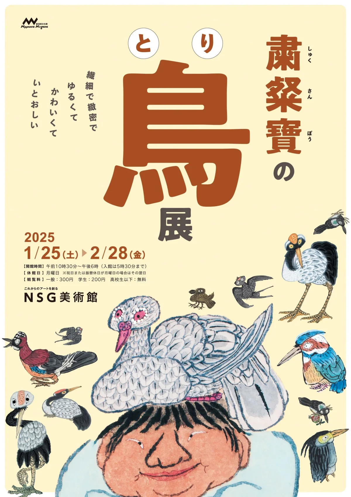 2025年1月25日(土)から2月28日(金)までの期間、新潟市に位置するNSG美術館で、著名な日本画家・粛粲寶(しゅくさんぽう)による特別展「鳥展」が開催されます。この展覧会では、彼が描いた約200点の中から特に「鳥」をテーマにした作品が中心に展示されます。