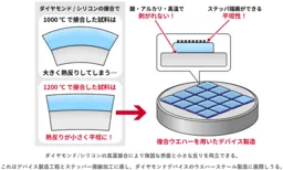 開発チームは、ダイヤモンドとシリコンの間の熱膨張量の差に注目し、その差を接合時の温度を高くすることで抑えられることを確認しました。通常、異なる材料を接合する際には、熱膨張による反りが問題となりますが、高温で接合することで、この反りを大幅に低減できることが示されました。条件としては500℃から600℃以上の高温が必要ですが、これによりダイヤモンド/シリコンの複合ウエハーが強固に接合されることが確認されました。