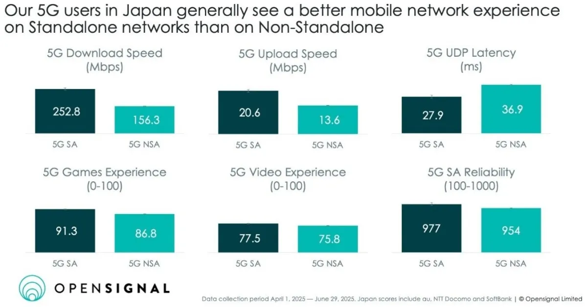 Opensignalは、日本の主要3社(au、NTTドコモ、ソフトバンク)が展開する5G SAのスコアを集計し、NSAとの比較を行いました。この結果、SAはダウンロード速度で約1.7倍、アップロード速度で1.5倍、UDP遅延で25%の短縮を達成しました。これによって、ユーザーの日常的な体験において大きな向上が見られました。