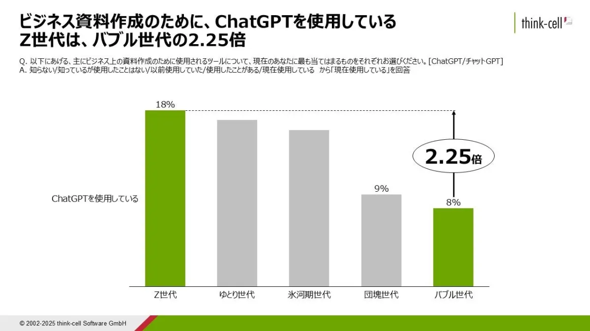 興味深いのは、ChatGPTの利用状況です。調査では、Z世代から氷河期世代までは約16~18%が利用しているのに対し、団塊ジュニアやバブル世代ではその数字が10%を下回る結果が出ています。この世代間の差はなんと2.25倍にも達しており、AI技術が世代ごとにどのように捉えられ、利用されているかが浮き彫りになりました。このことは、デジタルディバイドに続き、AIにおける利用格差が存在することを示唆しています。