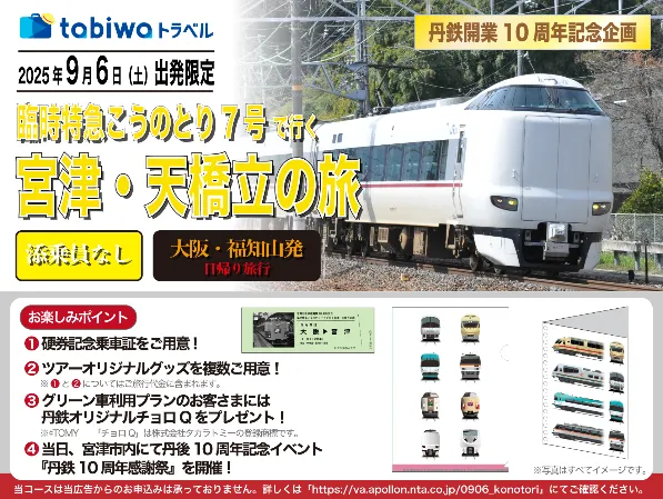 当日は、『臨時特急こうのとり7号』を利用した『宮津・天橋立の旅』ツアーも同時に発売されます。この特急は大阪や福知山から宮津への移動に便利で、途中の絶景をお楽しみながらの旅行が可能です。ツアー参加者には、記念乗車証やオリジナルグッズ、さらに丹鉄オリジナルのチョロQもプレゼントされる特典があります。