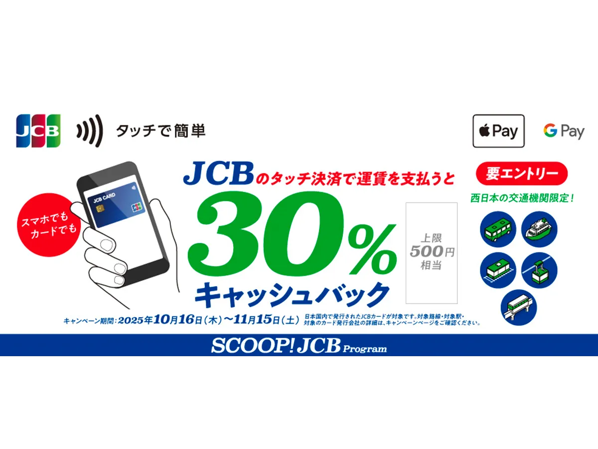 株式会社ジェーシービーが、2025年10月16日から11月15日までの期間限定で「JCBのタッチ決済で公共交通機関に乗ろう!30%キャッシュバックキャンペーン」を実施します。本キャンペーンは公共交通機関向けのキャッシュバックプログラムの4回目であり、今回の対象エリアは西日本(関西・中国・四国・九州・沖縄)です。