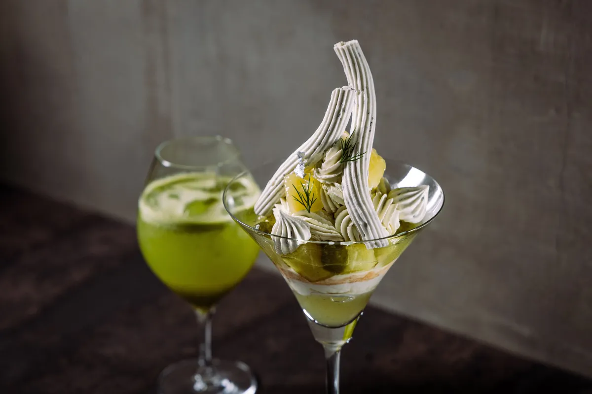 『八女茶とマスクメロンの利休ヴァシュランパフェ』には、アルコールとノンアルコールのペアリングカクテルも用意されています。アルコールの「八女の新茶とオリーブのスプリッツァー」は、クリーミーなエスプーマで仕立てた新茶をベースに、国産ワインやメロンと茶ソースを加えた、爽やかな飲み口が魅力です。また、ノンアルコールの「八十八夜の新茶ソーダ」は、茎茶「白折」を使ったソーダで、新茶の新鮮さを楽しむことができます。