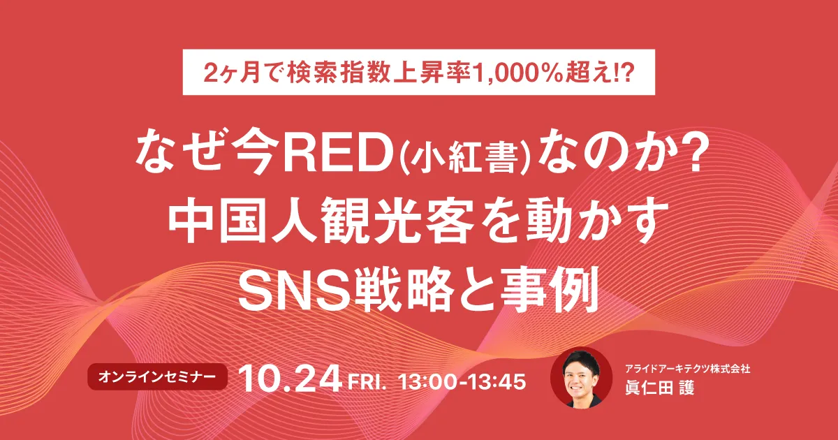 アライドアーキテクツ株式会社は、10月24日(金)に無料のオンラインセミナーを開催します。このセミナーでは、「2ヶ月で検索指数上昇率1,000%超え!?なぜ今RED(小紅書)なのか?」をテーマに、中国人観光客へのアプローチ方法や最新のSNS戦略について詳しく解説します。