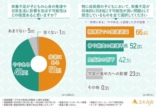 近年の調査によると、子どもの栄養状態が心身の発達や日常生活に大きな影響を与える可能性が非常に高いことが明らかになりました。スリーエー・ライフ株式会社が1,003名の医師を対象に行ったこの調査では、約90%が「栄養不足が影響を及ぼす」との意見を持っており、特に精神面や身体面での発達に懸念を抱いていることがわかります。
