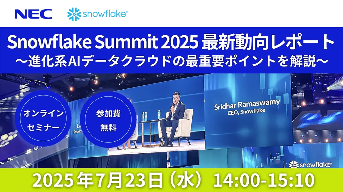 2025年7月23日、NECは「Snowflake Summit 2025」に関するオンラインセミナーを開催します。このセミナーは、NECメンバーが現地で得た知見をもとに、最新の技術や業界のトレンドをわかりやすくまとめて紹介するもので、参加は無料です。登録は事前に行う必要がありますが、業務でのデータ利用に役立つ貴重な情報を得る絶好の機会となっています。