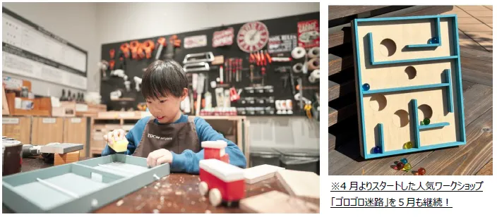 今年のゴールデンウィークでは、お子さま向けのワークショップが充実しています。「子供でも作れるタイルを使ったワークショップがあったら嬉しい!」というお客様の声をもとに作られた「カラフルフック」、毎年好評のマスキングテープ「mt.」を使用した新作も登場します。4月から新たに始まった「ゴロゴロ迷路」など、毎日通っても楽しめるメニューが揃っています。