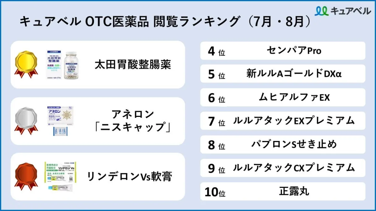 ウィルベース株式会社が運営する市販薬・サプリ選定支援アプリ「キュアベル」を基に、2025年7月と8月に最も閲覧されたOTC医薬品のランキングが発表されました。このデータは、約13万人のキュアベルユーザーが作成したもので、多くの人々がどの医薬品に関心を持っているのかが明らかになっています。