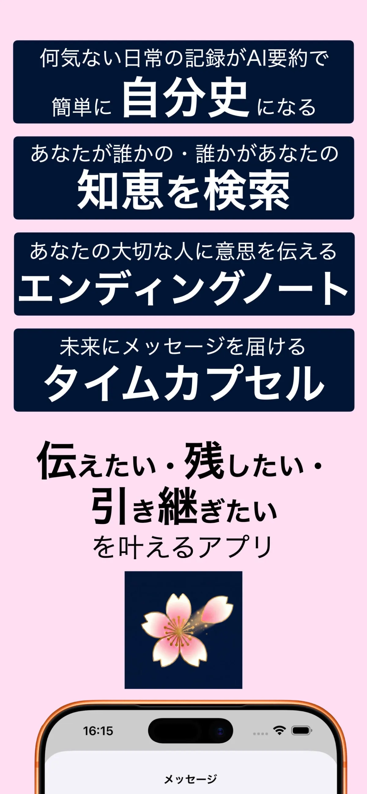 本サービスは、ただのジャーナルやエンディングノートアプリではありません。ユーザーは日常の出来事を気軽にアプリに記入することで、AIがそれを美しい「自分史」に変換します。また、特定の大切な人々と必要な情報を安全に共有できます。このアプリの最大の特徴は、「原文を見せずに要約を見せる」機能です。この方式により、ユーザーの内面や感情が他者に晒されることなく、想いを伝えられるのです。