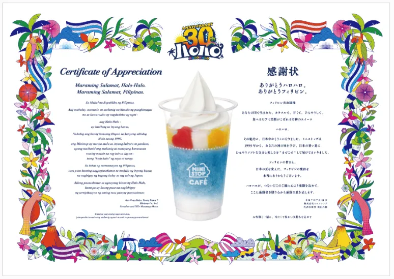2023年7月31日、ミニストップはフィリピン大使館にて、ハロハロの原点であるフィリピンへの感謝状を贈呈しました。代表取締役社長の堀田昌嗣氏と、駐日フィリピン大使ミレーン・デ・ホヤ・ガルシア=アルバノ氏がそれぞれの国のハロハロを試食し、その魅力を語り合いました。堀田社長は、「ハロハロを食べるたびに笑顔が広がるようなスイーツとして、さらなる挑戦を続けていきたい」と語りました。